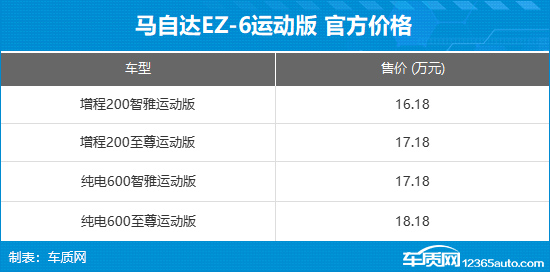 6月9日,车质网获悉,长安马自达EZ-6运动版正式上市,新车推出4款车型,售价区间16.18-18.18万元。新车的推出进一步丰富了马自达在新能源市场的产品布局。