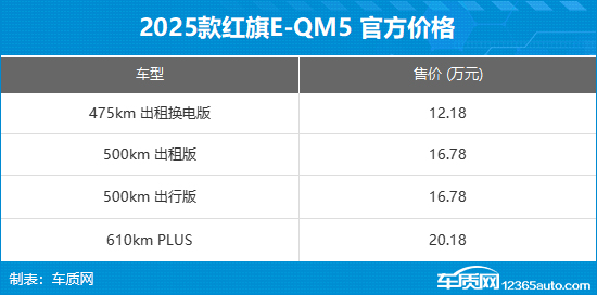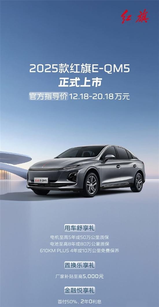 6月10日,2025款红旗E-QM5正式上市,新车推出4款车型,售价区间12.18-20.18万元。官方还推出三重礼遇,包含电池至高8年保障、至高享5000元厂家补贴以及首付50%享2年0息金融方案等。