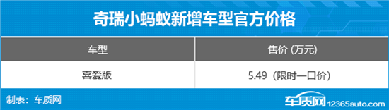 6月10日,奇瑞小蚂蚁新增一款喜爱版车型,限时一口价5.49万元。同时,官方提供三电+整车终身质保政策。