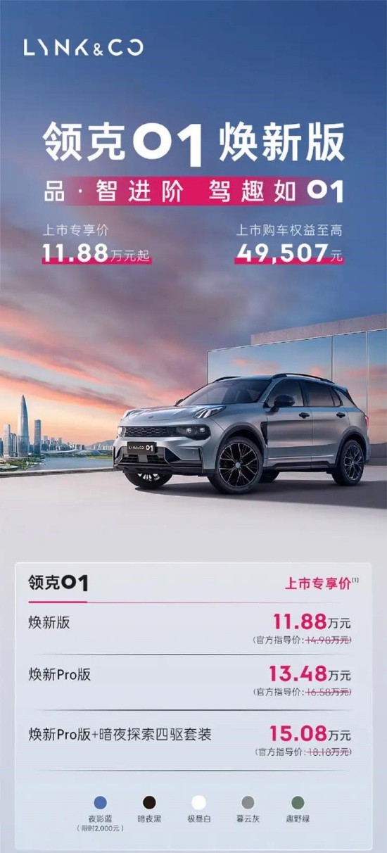 6月10日,领克旗下领克01焕新版正式上市,新车共推出3款车型,售价区间为14.98-18.18万元,上市专享价为11.88-15.08万元。同时,新车推出了全新夜影蓝车色,限时2000元选装。此外,官方还表示,从即日起至7月31日前下订领克01焕新版,可享至高49507元的限时购车权益。