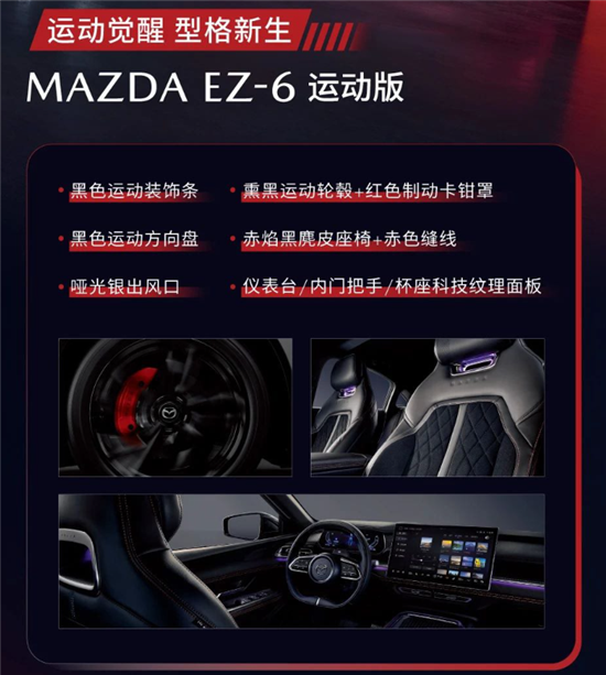 外观方面,EZ-6运动版延续了马自达“魂动”设计理念,同时融入更多运动化元素。溜背式车身搭配全黑色侧裙饰条,与19英寸熏黑运动轮毂及红色制动卡钳罩相结合,强化运动氛围。尾部方面,贯穿式尾灯组与小鸭尾扰流板设计,提升整体辨识度。